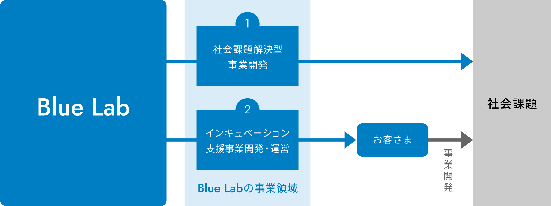 「社会課題解決型事業開発」と「インキュベーション/スキル・マインドアップ支援」。この2つを事業の柱に社会課題の解決を行うことで、Blue Labに対するお客さまの認知を高め、新たな事業開発の種を継続的に持ち込んでいただく存在となれることをめざしています。