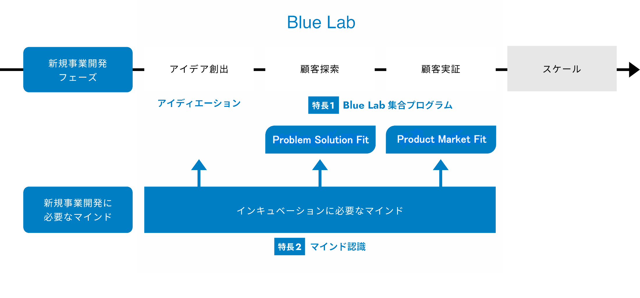 インキュベーションに特化した組織であるBlue Labでは、アイデアの創出から顧客探索・実証・スケールまでに必要な、スキル・マインド・ナレッジにおいて、独自の「型」を用いた新規事業開発に取り組んでいます。