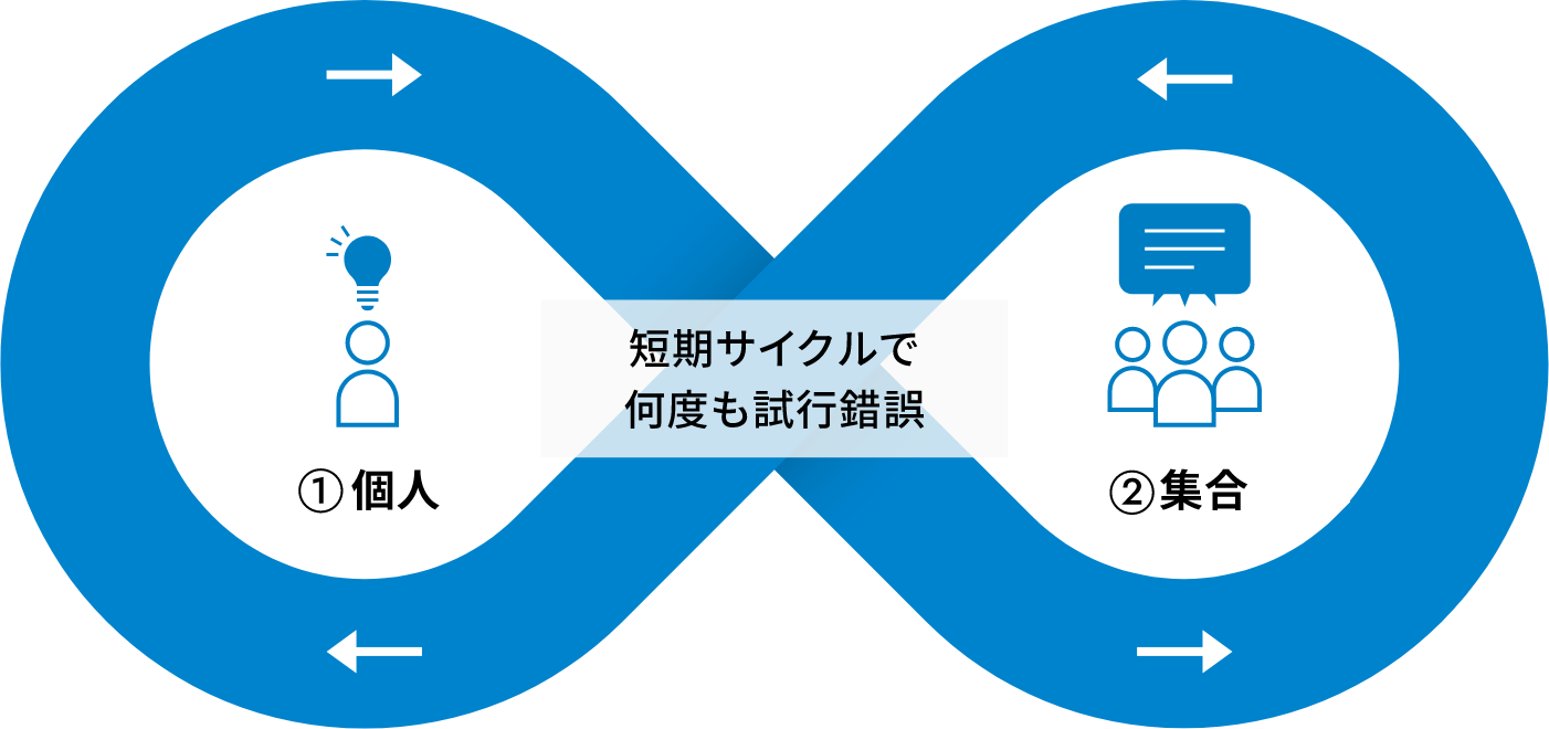 参画するメンバー個人が思い描いた事業アイデアに対し、チームが集合し対話や意見交換、アイデアブレスト等を短いサイクルで実施。そこで得た結果を基に、さらに個人の考えを深めていきます。この繰り返しを数か月に渡って行うことで、アイデアの絶え間ないブラッシュアップを続けていきます。