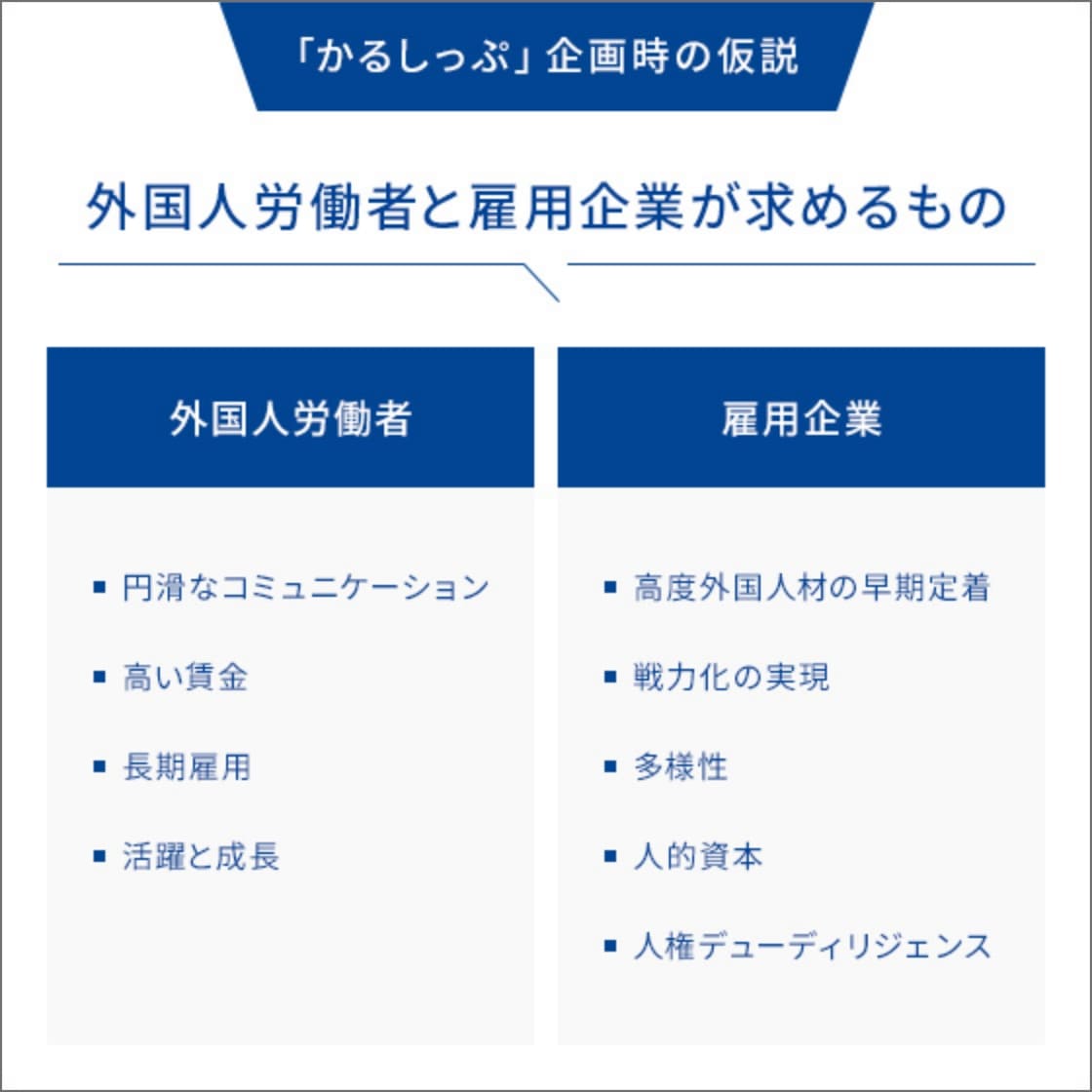 「かるしっぷ」は、残念ながらサービスの実現まで至りませんでしたが、グローバルビジネスへ挑戦したいという強い想いは変わりません。日本の人口減少と、それに伴う働き手の不足は企業の存続において解決すべき重要な課題であり、日本の文化を理解し、適切にコミュニケーションを取れる外国人材へのニーズは、これからもさらに高まると思います。
