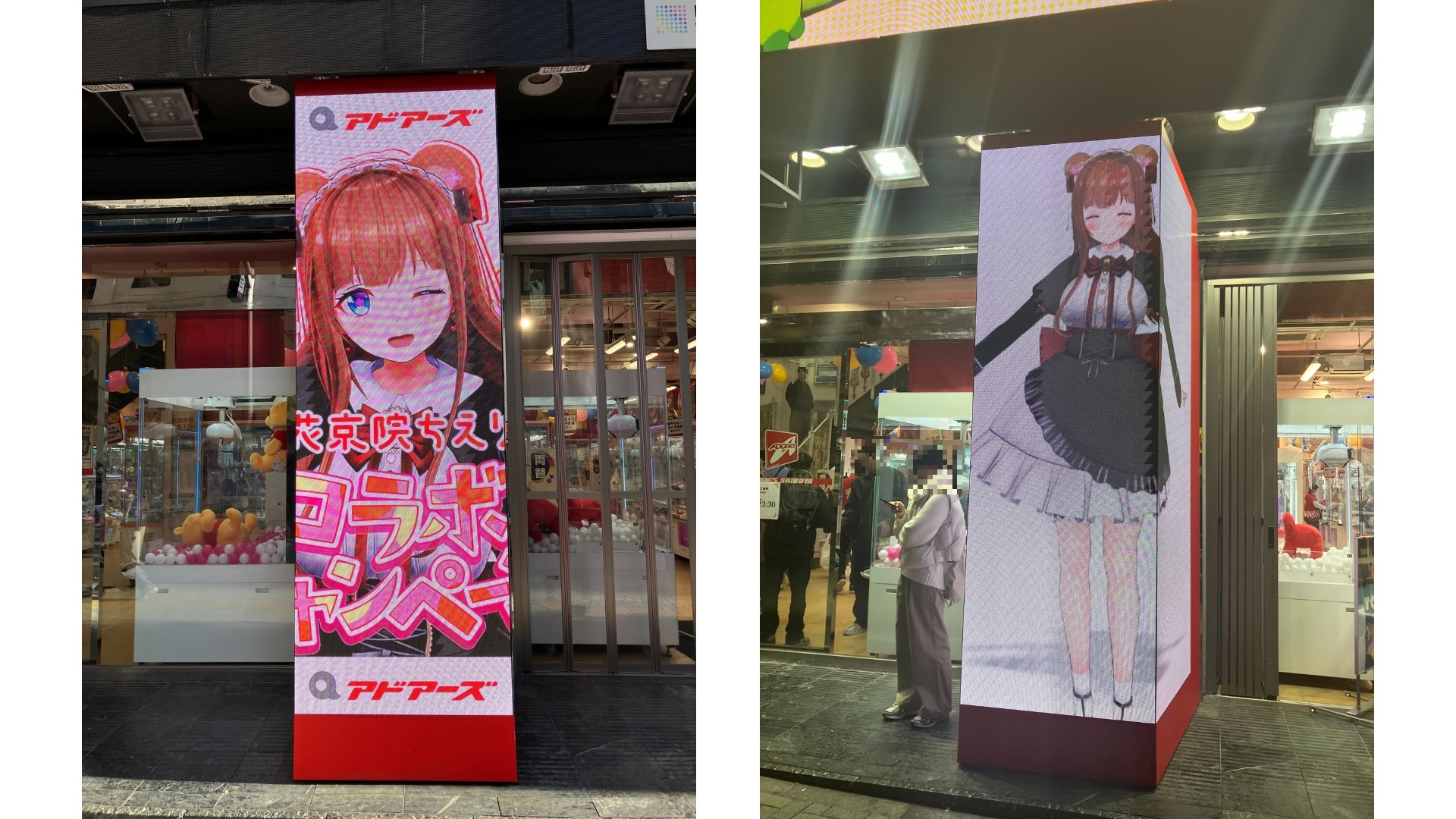 アドアーズ渋谷店限定で、路面に面した縦3メートルの大型ディスプレイに花京院ちえりが登場。この迫力ある映像体験は、コラボイベントでしか見ることができない限定コンテンツとなりました。