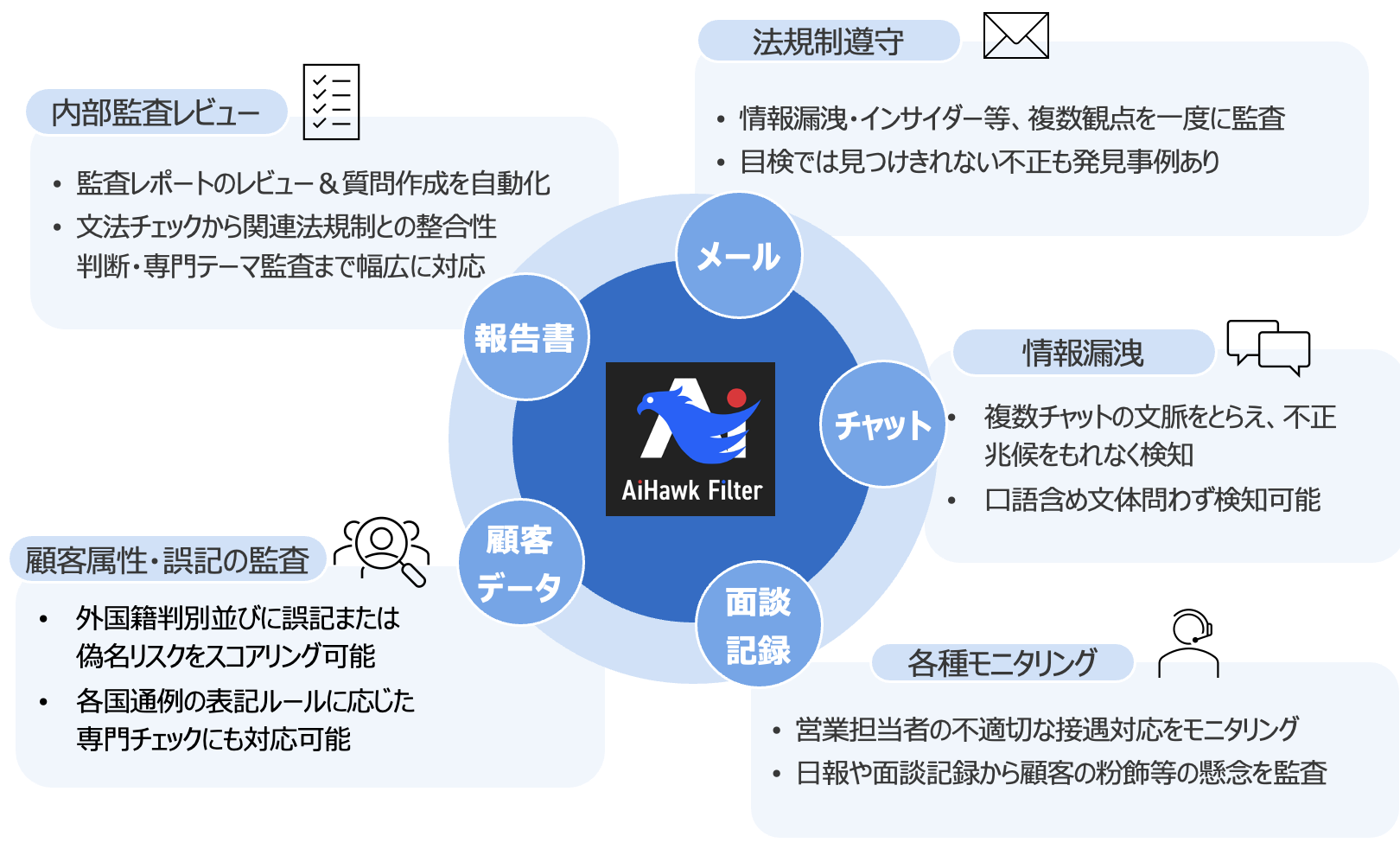 「AiHawk Filter(アイホークフィルター)」は、生成AIを活用して社内メールなど各種データの内容を分析し、コンプライアンス違反やリスクの可能性がある文章を自動検出します。これにより、従来は人手で行っていた監査業務を大幅に効率化することができるサービスです。