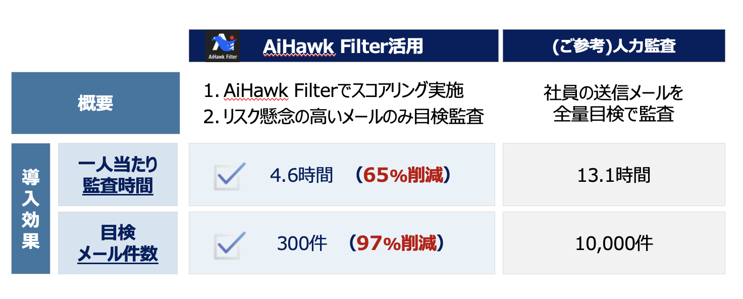 みずほ銀行と協働したPoC(実証実験)では、1人あたりのメール(1年分)の監査に平均13.1時間かかっていたところ、 AiHawk Filterを活用することで平均4.6時間に減り、およそ65%の業務効率化を達成しました。不正懸念のあるメールを絞り込み、確認箇所をレコメンドすることで、監査で確認すべき対象メールは97%削減され、その精度も業務に適用可能なレベルの再現率となっています。