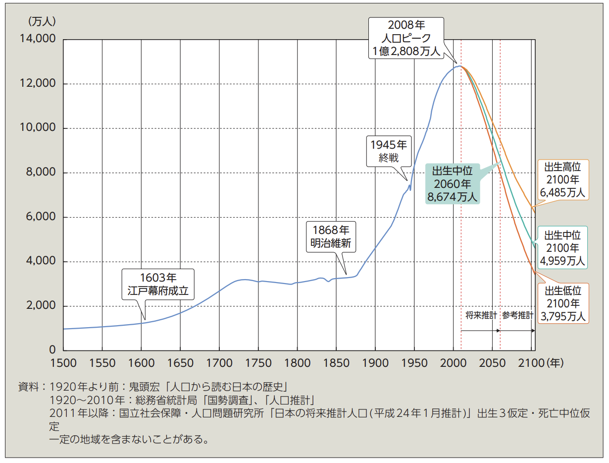 出典:「『平成27年版 厚生労働白書 -人口減少社会を考える-』」厚生労働省 より「長期的な我が国の人口推移」