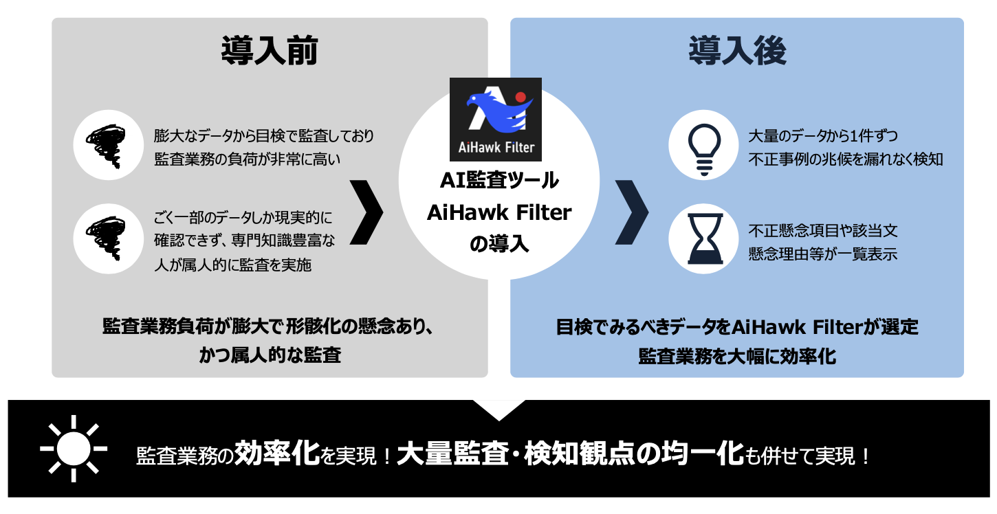 監査業務は高度な専門性が求められるため、これまで社員の目視や手作業に依存しており、膨大な労力が掛かっていました。「AiHawk Filter」の生成AIが支援することで業務効率化や高度化につながるのはもちろん、その労力を軽減することで、社員はより創造的な業務に集中でき、属人化や形骸化を排した監査体制を構築できるようになります。