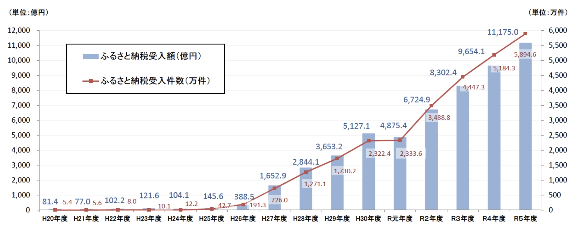 ふるさと納税は、2023(令和5)年度に約1兆1175億円、約5895万件と、これまでに大きく受入額・受入件数を拡大してきました。